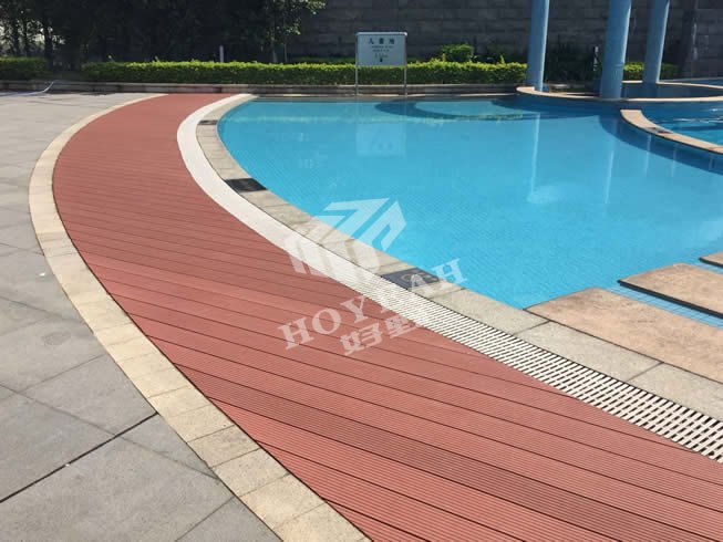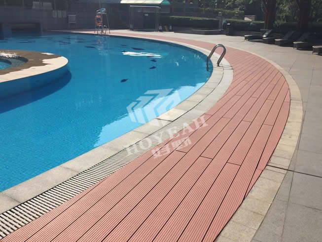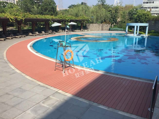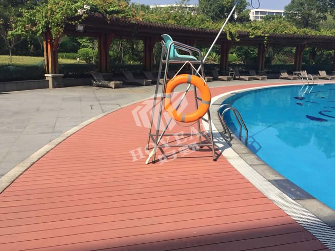 项目简介:项目位于广州开发区广州日航酒店游泳池铺装,酒店对产品的质量、环保、美观要求严格,采用好野塑木规格:145X30MM 红木色地板铺装,酒店领导现场对地板验收检测。