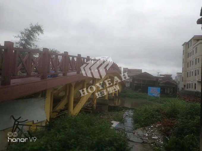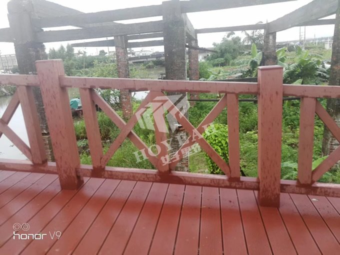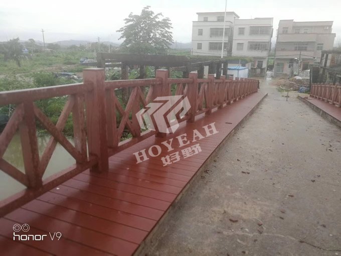 项目简介:该项目位于珠海市红旗镇为建设新农村旧桥改造环保工程,采用好野栏杆材料栏杆规格为:120X120MM立柱、90X45MM格条、80X80MM横梁,150X25MM红木色地板。